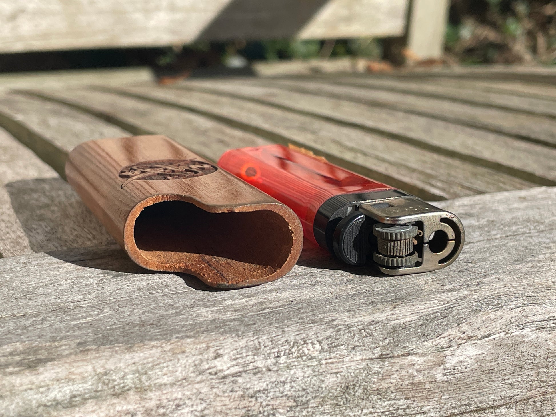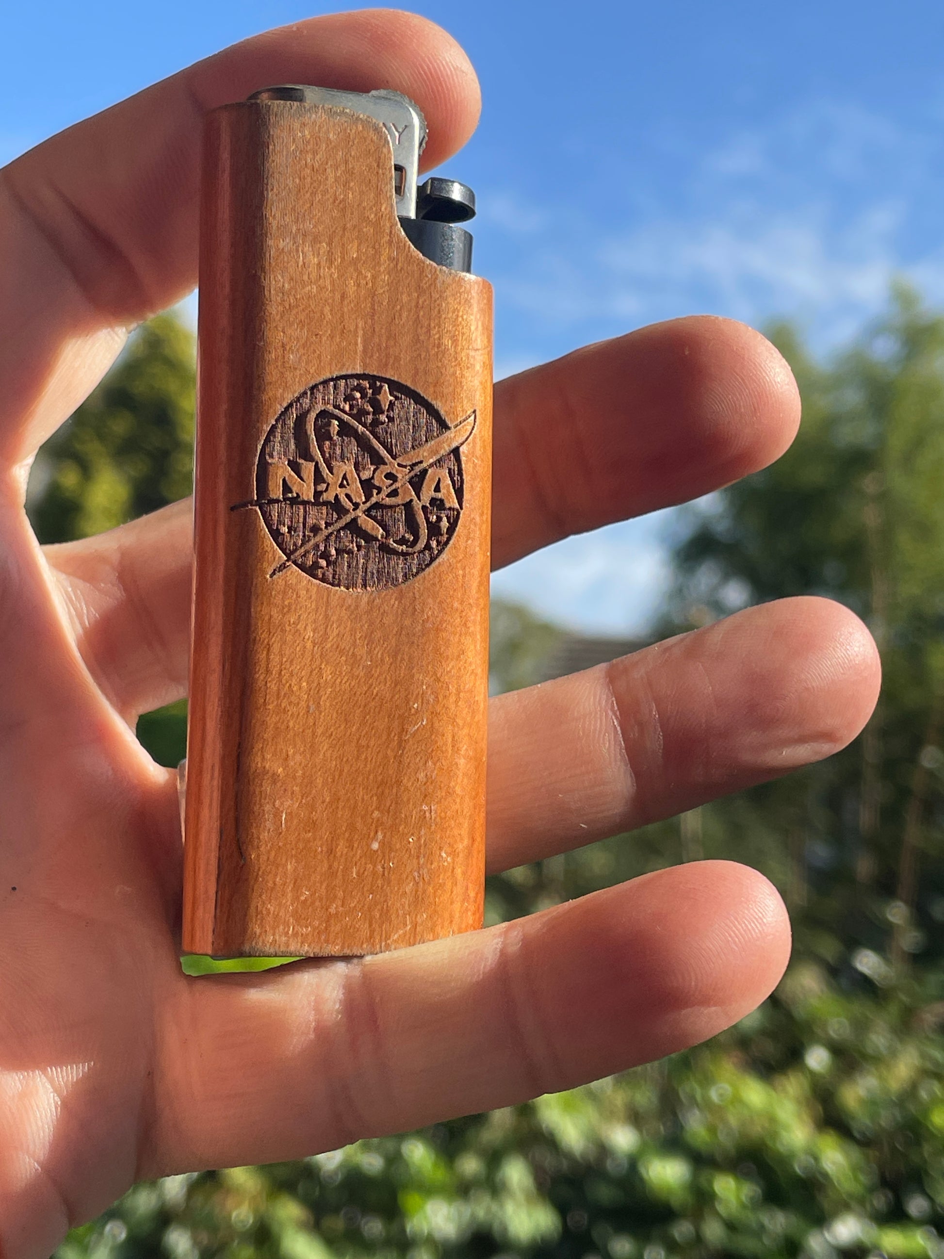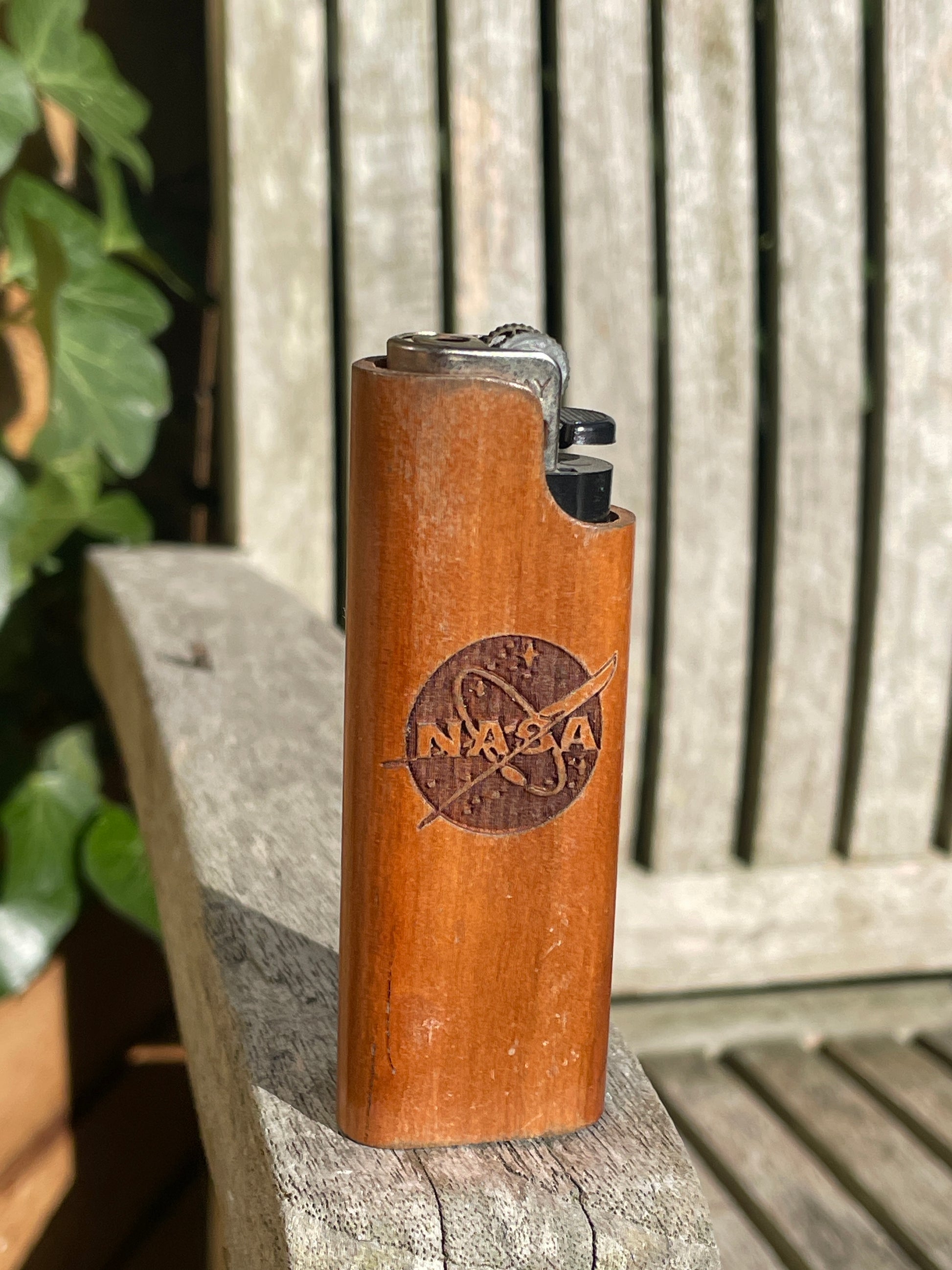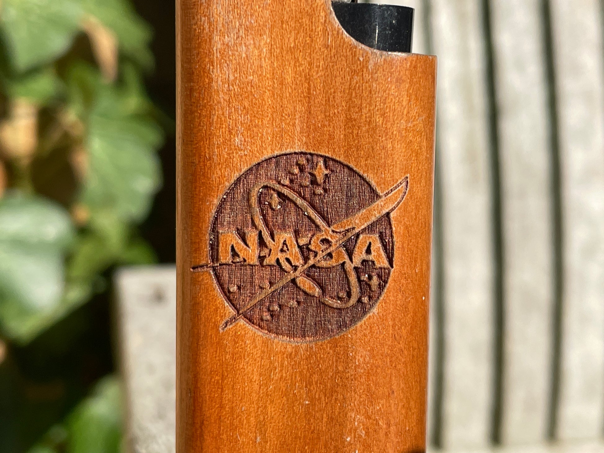 This is a really cool Nasa souvenir - hand carved Nasa logo wooden lighter cover from Wayne Carver. Woodland lighters. Made in the USA.
