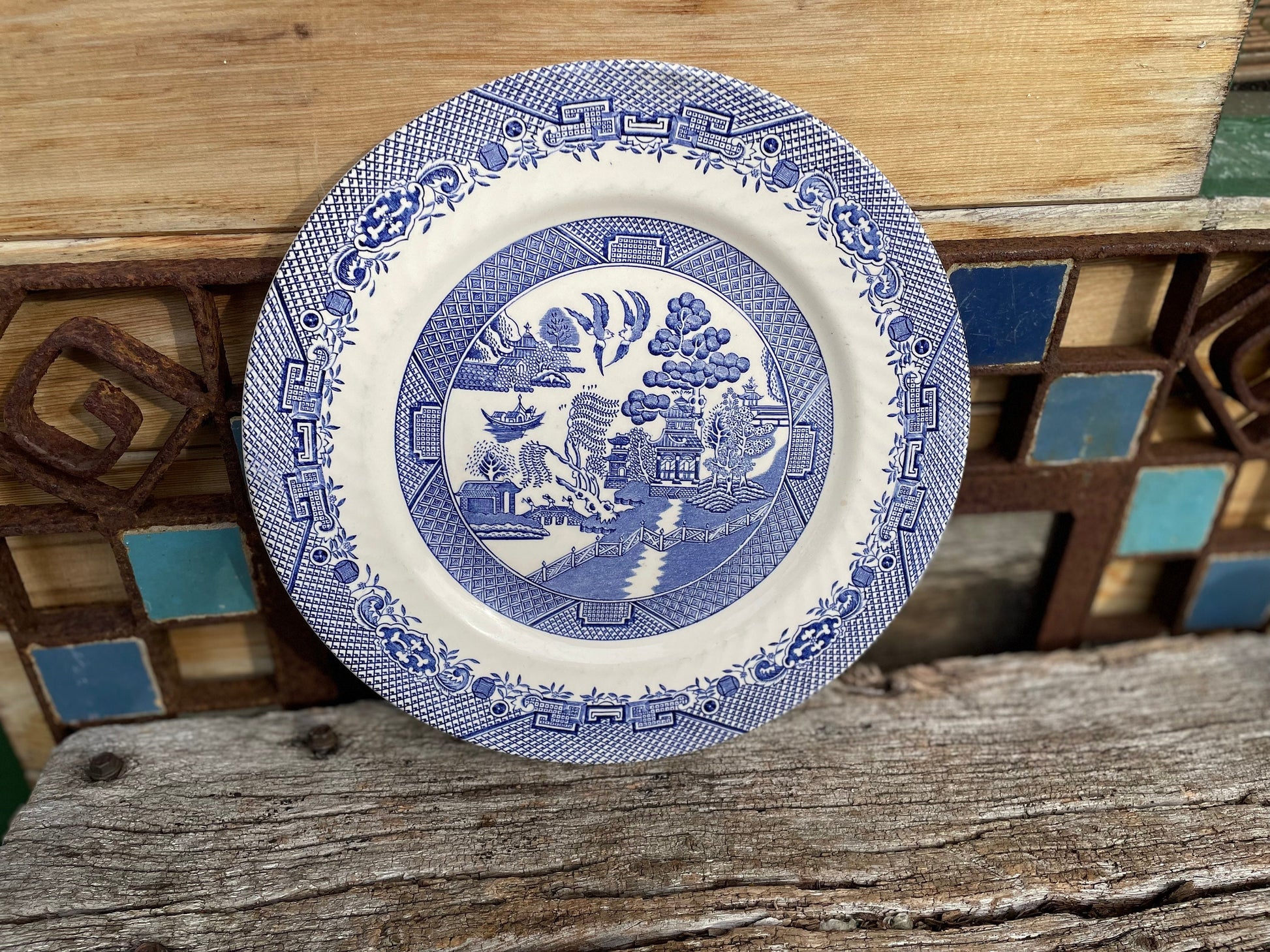 The oldest Chinese pattern with approximately 200 years of history. This vintage dinner plate is the Willow version by Barratts, Staffordshire, England. On sale in the 1950s.
