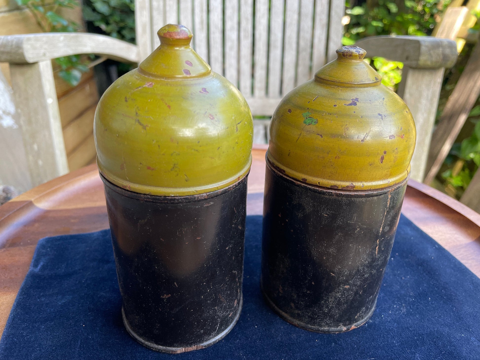 Two characterful storage vessels from Jodhpur, the second-largest city of the north-western Indian state of Rajasthan after its capital Jaipur. These are mid century vintage in age and are a lovely lime colour with a perfect contrasting black base. There is paint loss but like all objects that have been used they will show signs of every day use but that is what we love isn't it? lovely pair of pots look great in any kitchen or sideboard